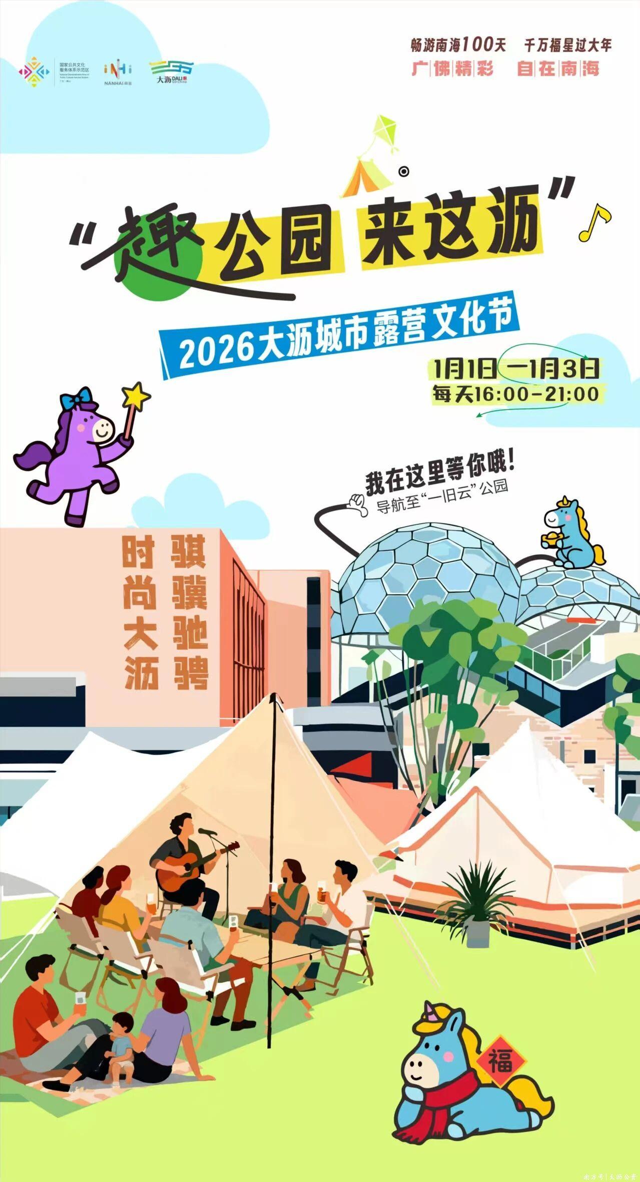 元旦期间,大沥镇结合南海区“公园新经济”行动计划,以“一旧云”公园为主会场,联动九龙欢乐PARK、TIC艺术营地等一批重点公园作为活动分会场,启动“骐骥驰骋 时尚大沥”2026大沥“趣公园 来这沥”城市露营文化节活动,凝聚多方力量庆元旦,活动将融入露营、美食、文创、村菜、音乐、大沥甄选好物等元素,给你全新多元体验。