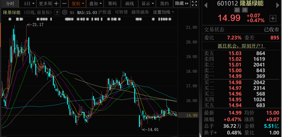 截至5月26日收盘,隆基绿能报14.99元/股,最新市值为1136亿元。