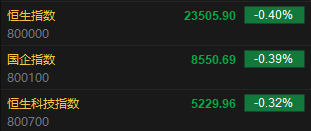 今日港股三大指数集体低开,恒生指数跌0.40%,报23505.90点,恒生科指跌0.32%,国企指数跌0.39%。盘面上,科网股普跌,网易跌超2%,联想集团跌超1%,哔哩哔哩涨超1%;黄金股普涨,潼关黄金涨超3%;药品股普涨,信达生物涨超3%;苹果概念股多股下跌,比亚迪电子跌超1%。